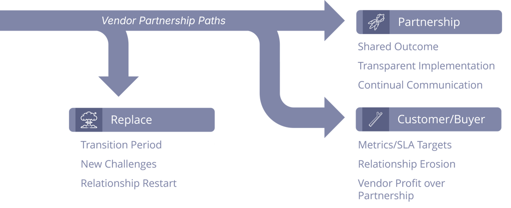 Like all relationships in life and business, there can be a cycle and a time for reevaluation and classification of what the relationship is and will continue to be. Early vendor-operator relationships are often fruitful, with both sides contributing to a shared success. As time moves forward, each side will need to continue working on the relationship, delivering value and a continued return on the invested partnership. Without this investment, complacency or diminished commitment to deliver may erode the collaboration. As the partnership evolves, each partner must evaluate their investment. The continued relationship requires a return on investment, clear expectations, and a clear understanding of the type of business relationship it will foster moving forward: transactional, partnered, or complex. The path forward on each may require growing together, scaling back, or evaluating replacement. Each management path brings potential rewards and challenges.